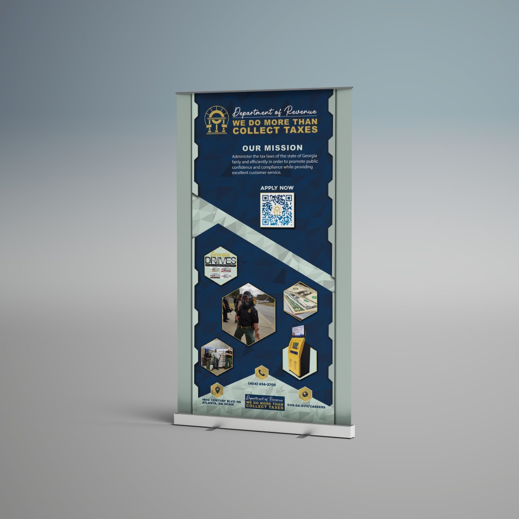 The Georgia Department of Revenue requested I create a retractable pull up banner for their upcoming job fair event. They wanted me to embody the feeling that they were an exciting workplace that does a lot more than just collect taxpayer dollars. I believe my design exhibits that vibe.